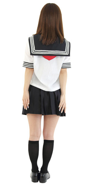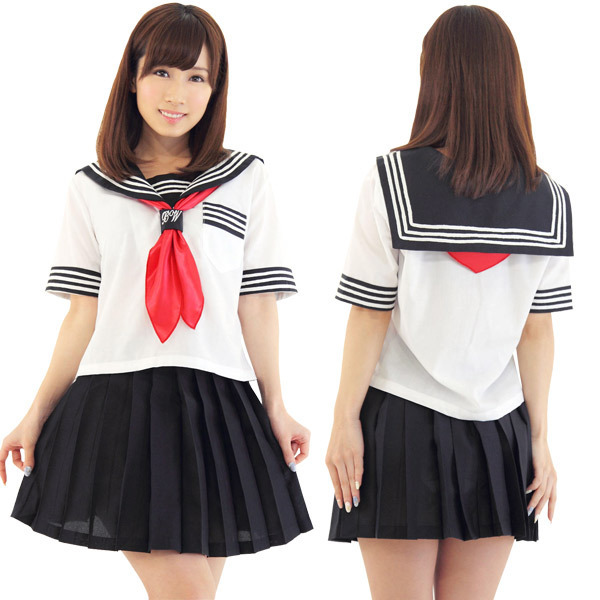 涼しげな夏服仕様の半袖タイプ!セーラー襟や袖のオーソドックスな3本ラインでリアル感も演出!ミニ丈のプリーツスカートがちょっぴりセクシーなスクール系コスチュームです。